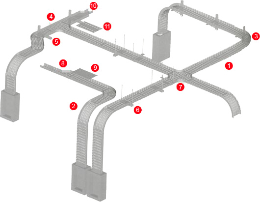 Description Of Points: 1- Straight Section Cable 2- 90 Vertical Elbow, Outside Riser 3- 90 Horizontal Elbow 4- Horizontal lee 5- Wall Support 6- Ceilling Support 7- Horizontal Cross 8- Left Hand Reducer 9- Solid Plain Cover 10- Straight Reducer 11- Ventilated Cover |